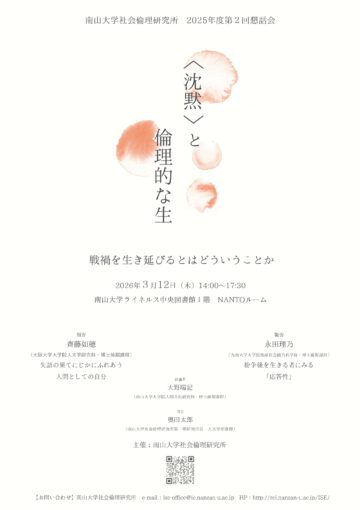 大阪大学大学院人文学研究科臨床哲学の齊藤 如穂さん(博士後期課程)が、南山大学社会倫理研究所2025年度第2回懇話会で発表します。タイトルは「失意の果てにじかにふれあう 人間としての自分」です。 日 …
