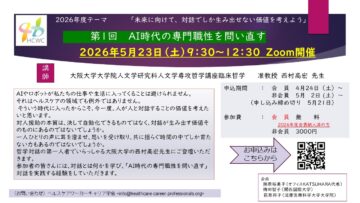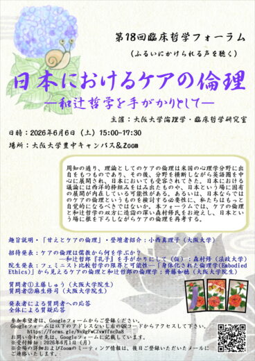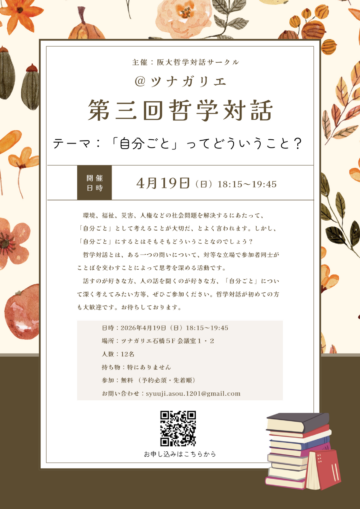 大阪大学大学院人文学研究科臨床哲学の麻生修司さん(博士前期課程2年)が、「@ツナガリエ第三回哲学対話」を開催します。テーマは「「自分ごと」ってどういうこと?」です。 日 時2026年4月19日(日)1…
